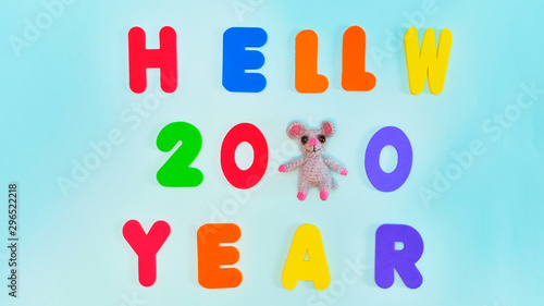 © Eduard Vladimirovich, Fototapeta premium Text, Hello new year 2020, in multicolored letters on a blue background. New year greetings