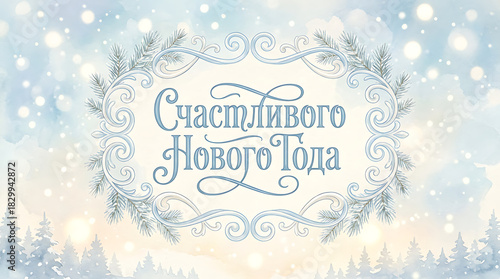© Leo Nasi, Naklejka premium Text in Russian: "Happy New year". Russian language. Cyrillic typographical on holidays background with winter landscape with snowflakes, light, stars. Vector Illustration. Xmas card