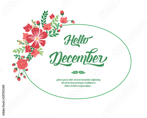 Naklejka premium Text of hello december background, with seamless red flower frame. Vector