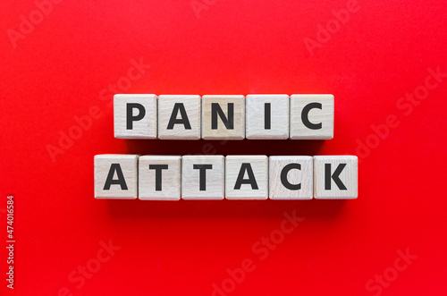 © hardvicore, Obraz premium Text PANIC ATTACK on wooden cubes. Mental health, disorder. Flat lay, top view on red background.