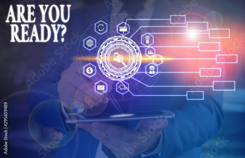 Fototapeta premium Text sign showing Are You Ready Question. Business photo text used telling someone start something when feel prepared Picture photo system network scheme modern technology smart device