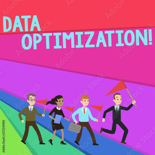 © A, Obraz premium Text sign showing Data Optimization. Business photo text process that prepares the logical schema from data view People Crowd Flags Pennants Headed by Leader Running Demonstration Meeting