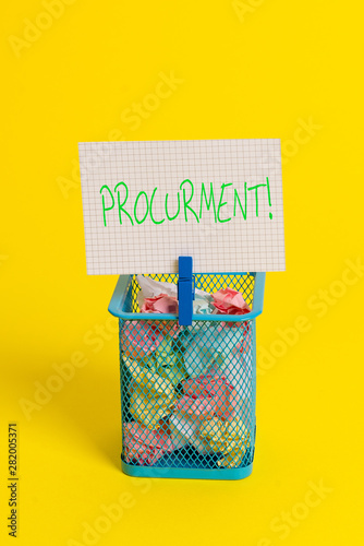 © A, Obraz premium Text sign showing Procurment. Business photo showcasing action of acquiring military equipment and supplies Trash bin crumpled paper clothespin empty reminder office supplies yellow