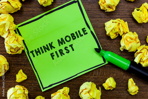 © Zofia, Naklejka premium Text sign showing Think Mobile First. Conceptual photo Easy Handheld Device Accessible Contents 24 or 7 Handy.