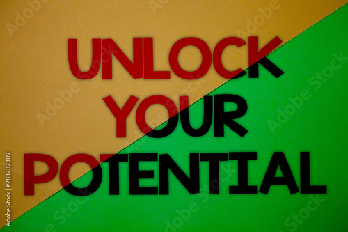 © Zofia, Fototapeta premium Text sign showing Unlock Your Potential. Conceptual photo access your true skills and powers Believe in yourself Yellow green split background message thoughts important information