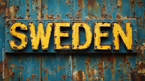 Fototapeta premium Text "SWEDEN" letters in rusty yellow letters with rustic background.