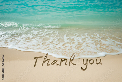 © kazakova0684, Fototapeta premium Text "Thank you" written on the white sand of a clean beach against the background of turquoise water..