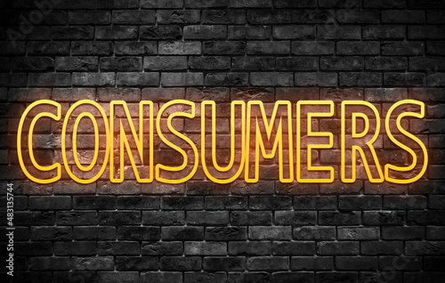 © Gabrieuskal, Fototapeta premium Texto de consumidor amarillo en neón amarillo.