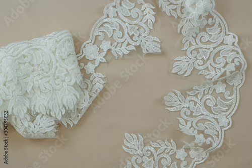 © MartaKlos, Obraz premium Texture lace fabric. lace on white background studio. thin fabric made of yarn or thread. a background image of ivory-colored lace cloth. White lace on beige background.