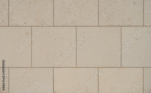 © Jarama, Naklejka premium texture of a tiled beige stone wall as background, natural stone wall texture as background. Close-up of a wall clad in limestone