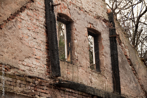 Fototapeta premium Texture of an old ragged wall background of old bricks and cracks in plaster...