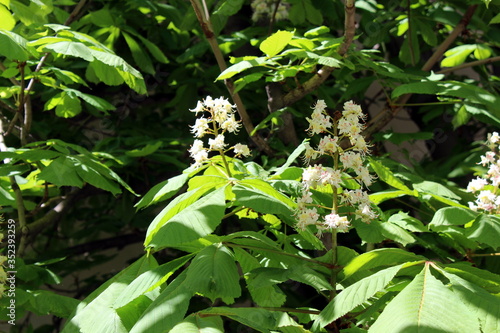 Obraz premium Texture of chestnut tree flowers with green leaves in spring