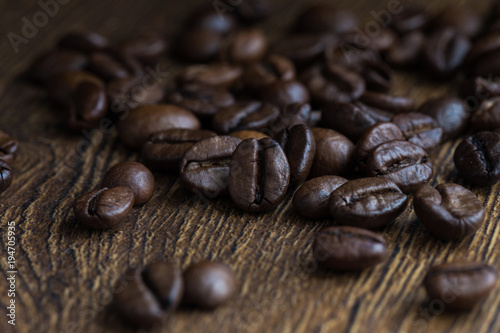 © vfhnb12, Naklejka premium Texture of coffee beans on a wooden background close-up.