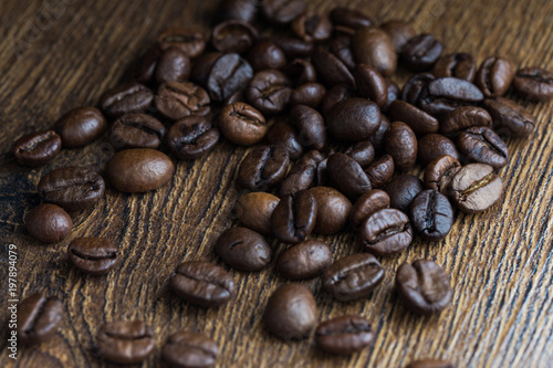 © vfhnb12, Naklejka premium Texture of coffee beans on a wooden background close-up.