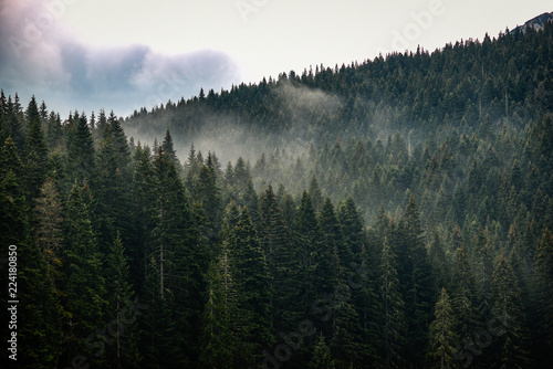 © Kozioł Kamila, Obraz premium Texture of conifers with fog between them.