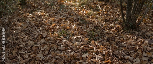 © vxnaghiyev, Obraz premium Texture of fallen bamboo leaves on ground with brown color