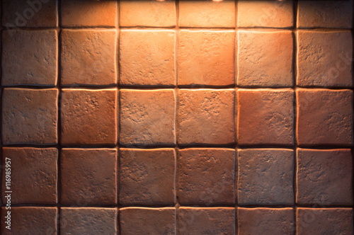 Naklejka premium Texture of fine ceramic tiles for kitchen wall illuminated from above. Close up tiled background.