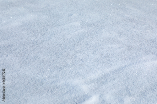 Fototapeta premium Texture of fresh snow covering ground thickly on frosty winter morning. Shallow DOF