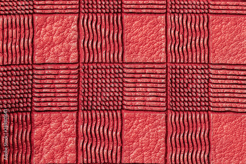 Fototapeta premium Texture of genuine plaid leather close-up, red color. For background, copy space
