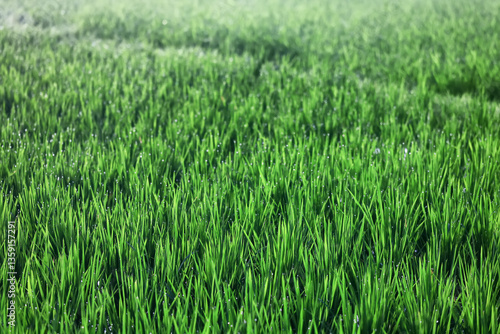 Fototapeta premium Texture of green fresh grass, rice field close-up