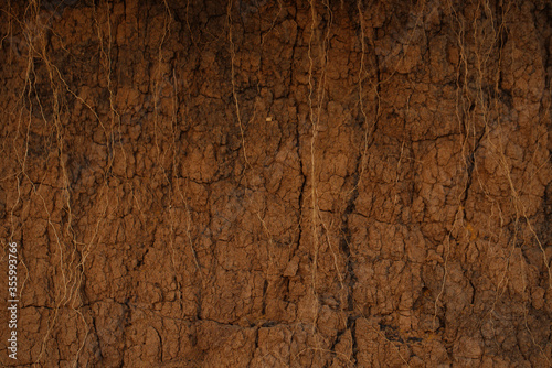 Fototapeta premium Texture of land dried up by drought, the ground cracks background with grunge. Black Soil Texture Background. Top View of a Dark Ground Surface. Close Up Macro View of Dirt and Stones. Soil and roots