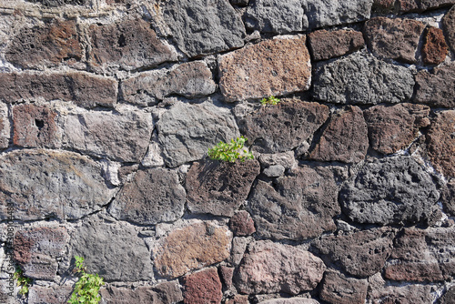 © Zakharenkova, Obraz premium texture stone masonry variegated large with sprouted grass