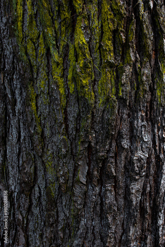Fototapeta premium texture view of gray tree bark surface with green moss