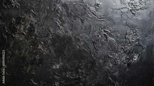 Fototapeta premium Textured black chalkboard surface with a deep, matte finish, complemented by a rough black wall background, creating a dramatic visual contrast.