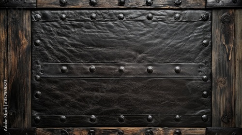 Fototapeta premium Textured black leather background framed by rustic wooden planks showcasing a...