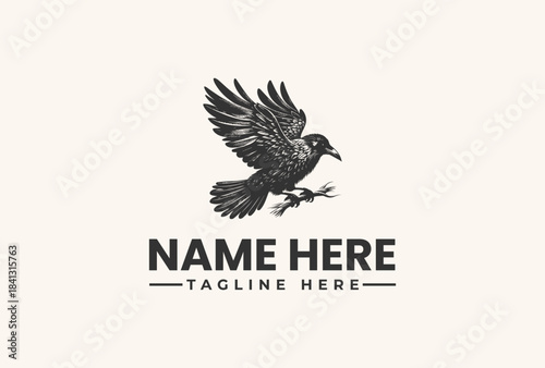 © vectorvovdesign, Obraz premium Textured black raven flying with majestic spread wings illustrated on white. Animal concept
