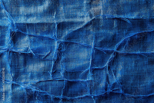 Naklejka premium Textured blue linen surface with intricate threads and patterns, creating visually striking and artistic appearance. deep blue color adds depth and richness to fabric
