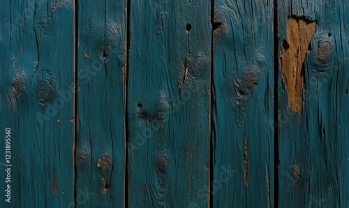© hocine, Naklejka premium Textured Blue Wooden Plank Background with Natural Knots and Weathered Areas for Use in Various Design and Artistic Projects