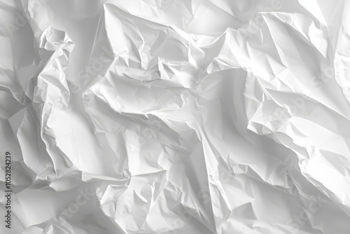 Fototapeta premium Textured crumpled white paper resting on a minimalistic surface, highlighting intricate folds and shadows in soft lighting