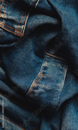 © 9BEi, Naklejka premium Textured Denim Fabric Close-Up Deep Blue Jeans Background