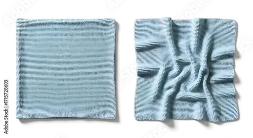 © amin, Fototapeta premium Textured Pair: Folded and Draped Pale Blue Knitted Blankets on White
