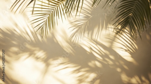 Obraz premium Textured palm leaf shadows cast softly on a warm, neutral wall, creating a...