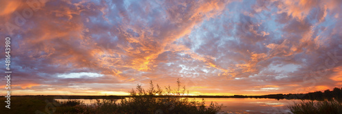 Fototapeta premium textured panorama of a colorful sunset over a lake with textured clouds and...