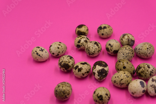 Fototapeta premium Textured spring background with small quail eggs. Eco products. Horizontal format .