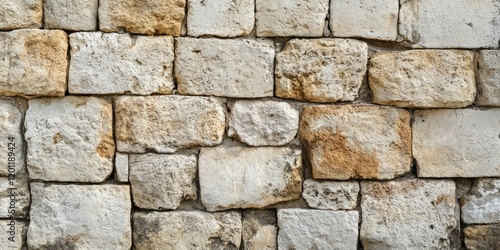 © Levan, Obraz premium Textured stone wall of an ancient building featuring irregular white and beige stones with rough surfaces arranged in a grid pattern