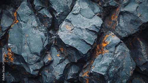 © Kanok, Fototapeta premium Textured surface of dark fractured stones with rust-colored accents, showcasing a raw and abstract natural geology background