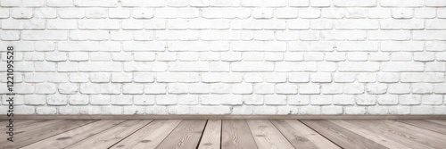 Fototapeta premium Textured white brick wall backdrop, rustic wooden floor , home decor, contemporary, white brick