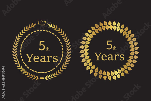 © Hello , Fototapeta premium 5th anniversary logo with golden color and silver stars confetti isolated black backgrounds for greeting cards, invitations, Wedding anniversary , banner and celebration company or business corporate