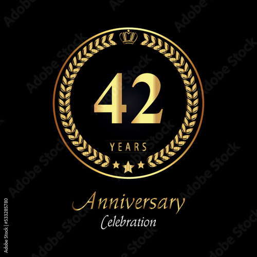 Fototapeta premium 42th anniversary logo with golden laurel wreaths, gold crown, and gold star...