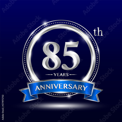 Fototapeta premium 85th Anniversary logo with retro style, silver color ring design and blue ribbon for anniversary celebration event. Logo Vector Template