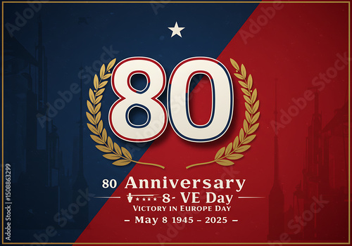 © Miftakhul, Naklejka premium 80th Anniversary VE Day Commemorative Design Template Patriotic Vintage Style