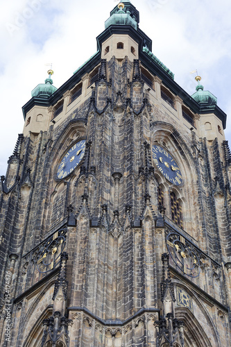 Fototapeta premium 14th century St. Vitus Cathedral , facade, tower with clock, Prague, Czech Republic.