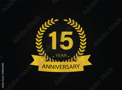 Naklejka premium 15th golden anniversary logo. with ring and ribbon.