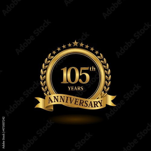Naklejka premium 105th golden anniversary logo with ring and ribbon, laurel wreath vector design. EPS 10