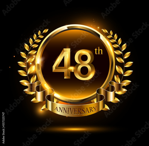 Naklejka premium 48th golden anniversary logo with ring & ribbon, luxury laurel wreath