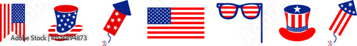 Naklejka premium 4th july Independence Day icons collection .Red, blue fireworks for 4th of July .Fourth of July elements .United States of America celebration bundle set. USA flag,fireworks,Uncle Sam hat,popper.